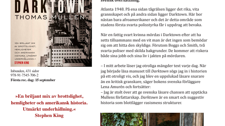 – Jag är stolt över att ge svenska läsare chansen att upptäcka Thomas Mullens författarskap. Darktown är en smart och suggestiv historia som blottlägger rasismens strukturer.
