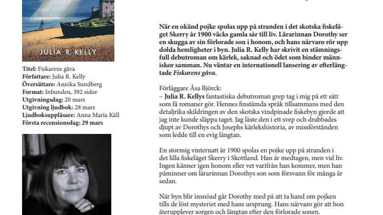 När en okänd pojke spolas upp på stranden i det skotska fiskeläget Skerry år 1900 väcks gamla sår till liv. Lärarinnan Dorothy ser en skugga av sin förlorade son i honom, och hans närvaro rör upp dolda hemligheter i byn. Julia R. Kelly har skrivit en stämningsfull debutroman om kärlek, saknad och ödet som binder människor samman. Nu väntar en internationell lansering av efterlängtade Fiskarens gåva.