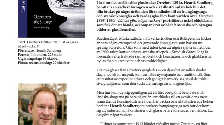 I år firar det småländska glasbruket Orrefors 125 år. Henrik Sandberg berättar i en vackert formgiven och rikt illustrerad ny bok hur det lilla bruket på några årtionden förvandlades till en framgångssaga och svenskt konstglas och vardagsglas blev känt världen över. Orrefors 1898–1930: ”Låt oss göra något vackert” porträtterar också eldsjälarna som fick det att hända, ackompanjerat av både historiska och nytagna bilder av glasföremålen.