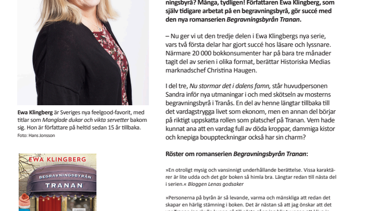 – Nu ger vi ut den tredje delen i Ewa Klingbergs nya serie, vars två första delar har gjort succé hos läsare och lyssnare. Närmare 20 000 bokkonsumenter har på bara tre månader tagit del av serien i olika format, berättar Historiska Medias marknadschef Christina Haugen.