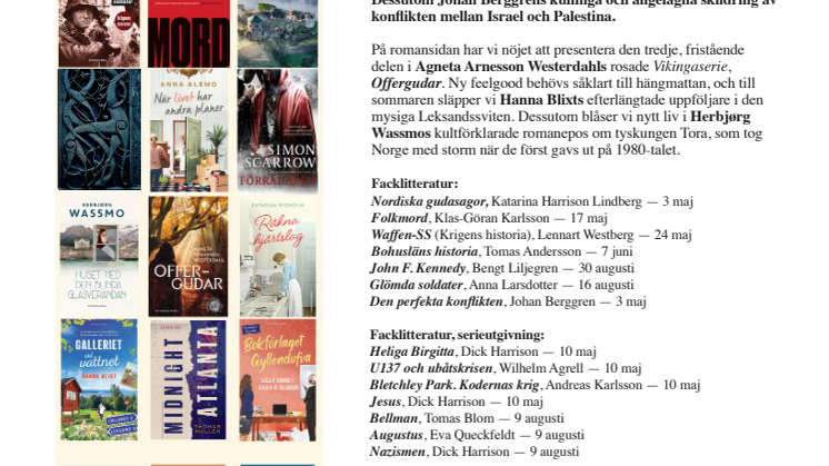 På romansidan har vi nöjet att presentera den tredje, fristående delen i Agneta Arnesson Westerdahls rosade Vikingaserie, Offergudar. Ny feelgood behövs såklart till hängmattan, och till sommaren släpper vi Hanna Blixts efterlängtade uppföljare i den mysiga Leksandssviten. Dessutom blåser vi nytt liv i Herbjørg Wassmos kultförklarade romanepos om tyskungen Tora, som tog Norge med storm när de först gavs ut på 1980-talet.