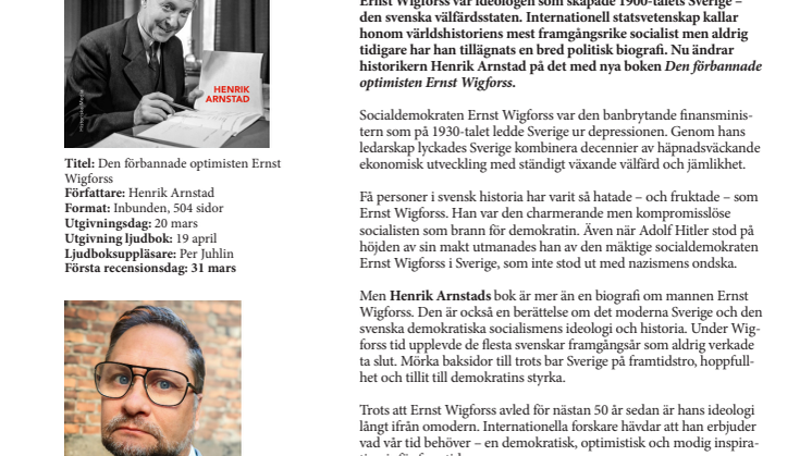 Ernst Wigforss var ideologen som skapade 1900-talets Sverige – den svenska välfärdsstaten. Internationell statsvetenskap kallar honom världshistoriens mest framgångsrike socialist men aldrig tidigare har han tillägnats en bred politisk biografi. Nu ändrar historikern Henrik Arnstad på det med nya boken Den förbannade optimisten Ernst Wigforss.