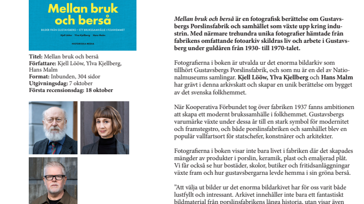 Fotografierna i boken visar inte bara livet i fabriken där det skapades mängder av produkter i porslin, keramik, plast och emaljerad plåt. Vi får också se hur bostäder, skolor, butiker och fritidsanläggningar växte fram och hur gustavsbergarna levde hemma i sin gröna berså.