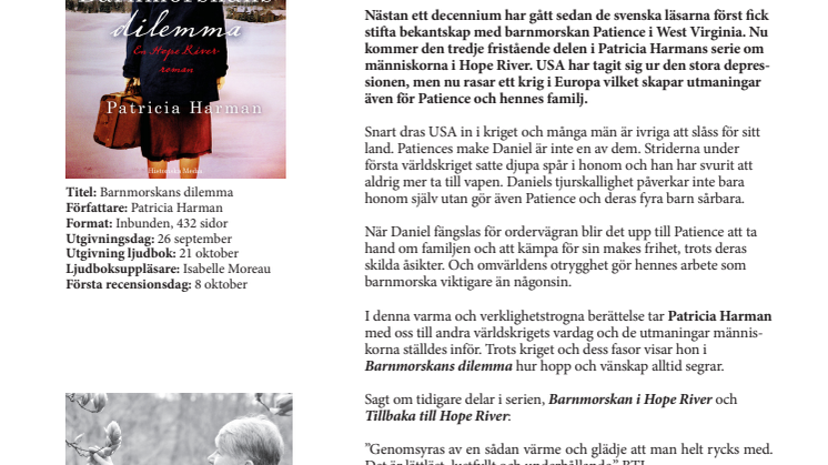 Nästan ett decennium har gått sedan de svenska läsarna först fick stifta bekantskap med barnmorskan Patience i West Virginia. Nu kommer den tredje fristående delen i Patricia Harmans serie om människorna i Hope River. USA har tagit sig ur den stora depressionen, men nu rasar ett krig i Europa vilket skapar utmaningar även för Patience och hennes familj.