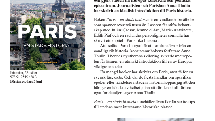 – En mängd böcker har skrivits om Paris, men få för en svensk läsekrets. Och där de flesta handlar om specifika epoker eller händelser i stadens historia hoppas jag att den här ger en känsla av helhet, utan att för den skull förlora ögat för detaljer, säger Anna Thulin.