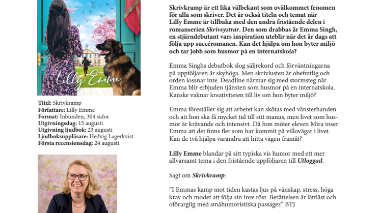 Skrivkramp är ett lika välbekant som ovälkommet fenomen för alla som skriver. Det är också titeln och temat när Lilly Emme är tillbaka med den andra fristående delen i romanserien Skrivsystrar. Den som drabbas är Emma Singh, en stjärndebutant vars inspiration uteblir när det är dags att följa upp succéromanen. Kan det hjälpa om hon byter miljö och tar jobb som husmor på en internatskola?