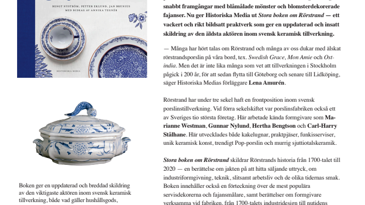 — Många har hört talas om Rörstrand och många av oss dukar med älskat Rörstrandsporslin på våra bord, tex. Swedish Grace, Mon Amie och Ostindia. Men det är inte lika många som vet att tillverkningen i Stockholm pågick i 200 år, för att sedan flytta till Göteborg och senare till Lidköping, säger Historiska Medias förläggare Lena Amurén.