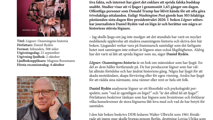 – Jag skulle ljuga om jag inte medgav att det stundtals har varit en mycket nedslående upplevelse att studera osanningens historia och skriva den här boken. Ljugandet verkar vara på frammarsch samtidigt som det farligaste hotet mot sanningen inte enbart är lögnen utan också likgiltigheten. Aldrig har det varit så lätt att sprida lögner som nu, säger Daniel Rydén.