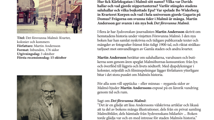 Hur fick Kärleksgatan i Malmö sitt namn? Vilka var Davids hallar och vad gjorde nippertanterna? Varför stängdes stadens saluhallar och vilka bojkottade Epa? Var spelade Bo Widerberg in Kvarteret Korpen och vad i hela universum gjorde Gagarin på Domus? Frågorna om svunna tider i Malmö är många. Martin Andersson ger svaren i sin nya bok Det försvunna Malmö.