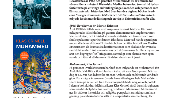 Revolternas år 1968 och profeten Muhammeds liv är ämnena för vårens första nyheter i Historiska Medias bokserier. Som alltid lyckas författarna på ett ringa sidomfång fånga skeenden och personer som lämnat avtryck i historien. Med över hundra utgivna böcker i serierna Sveriges dramatiska historia och Världens dramatiska historia erbjuds fascinerande läsning och en väg in i historieämnet för alla.