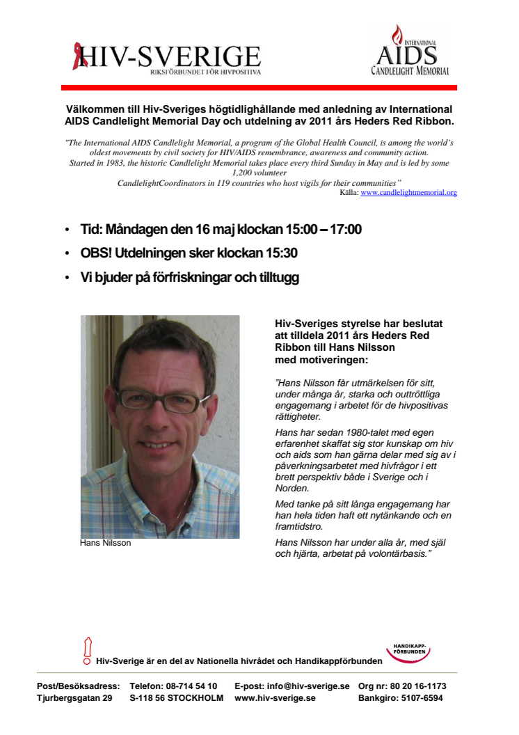 Inbjudan till Hiv-Sverigs högtidlighållande av Internalinal AIDS Candlelight Memorial Day 2011 måndagen den 16 maj.
