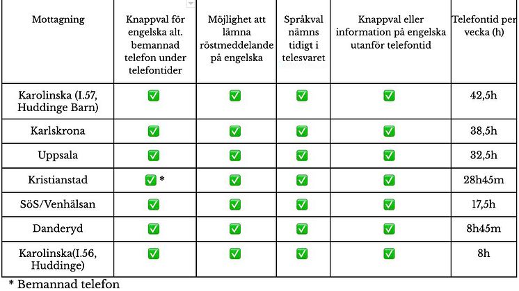 Anmärkningsvärt är att vid två kliniker bryts samtalet efter att engelska valts med knappval. Vissa mottagningar ger visserligen ut direktnummer eller “jobbtelefon”-nummer som personer som lever med hiv kan vända sig till, men det hjälper föga den som redan inte har dessa kontakter. I samtal med en infektionsmottagning kommenterade vårdpersonal att språkval under och efter telefontid inte var något de tänkt på, då de själva inte använder den typen av service.