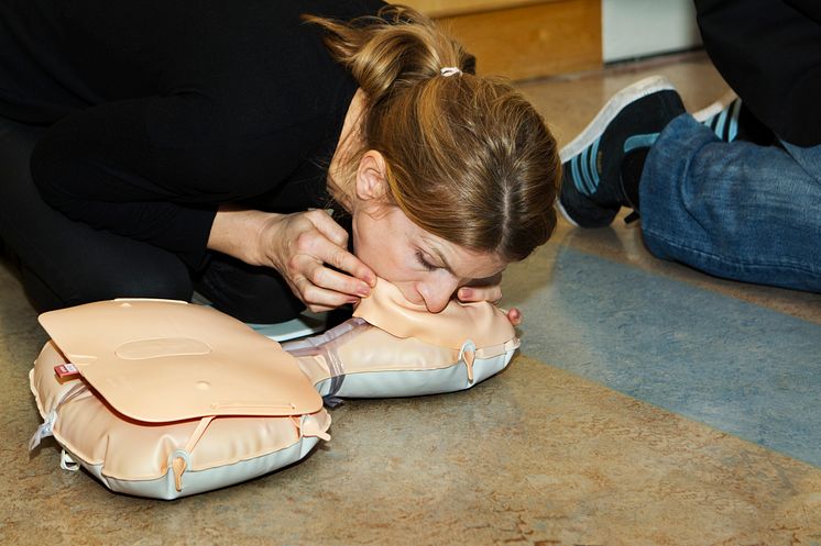 Inblåsning vid plötsligt hjärtstopp. Visas av Ingela Spongh, Hjärt-Lungfonden.