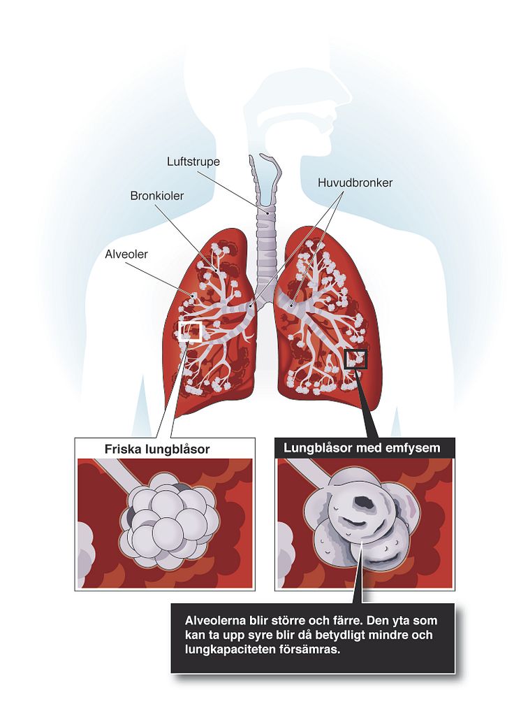 Lungor angripna av KOL. Bilden illustrerar vad som händer när lungorna angrips av KOL.. Illustratör: Kjell Eriksson