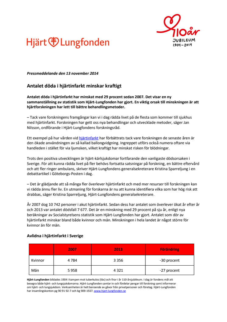 År 2007 dog 10 742 personer i akut hjärtinfarkt. Sedan dess har antalet som överlever ökat år efter år och 2013 var antalet dödsfall 7 677. Det är en minskning med 29 procent på sju år, enligt nya beräkningar av Socialstyrelsens statistik som Hjärt-Lungfonden har gjort. Antalet som dör av hjärtinfarkt minskar bland både kvinnor och män. Minskningen i hela landet är något större för kvinnor än för män.