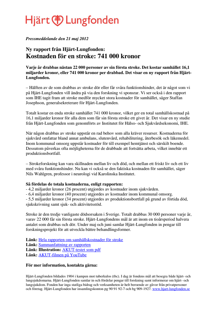 – Hälften av de som drabbas av stroke dör eller får svåra funktionshinder, det är något som vi på Hjärt-Lungfonden vill ändra på via den forskning vi sponsrar. Vi ser också i den rapport som IHE tagit fram att stroke medför mycket stora kostnader för samhället, säger Staffan Josephson, generalsekreterare för Hjärt-Lungfonden.