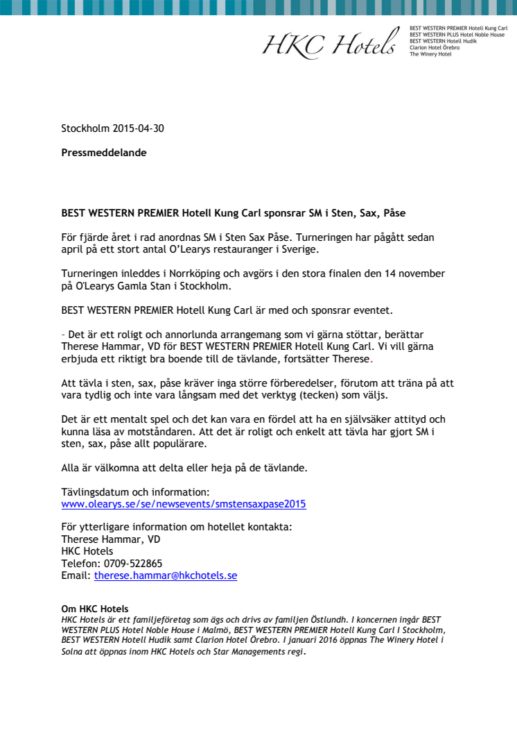 BEST WESTERN PREMIER Hotell Kung Carl sponsrar SM i sten, sax, påse!