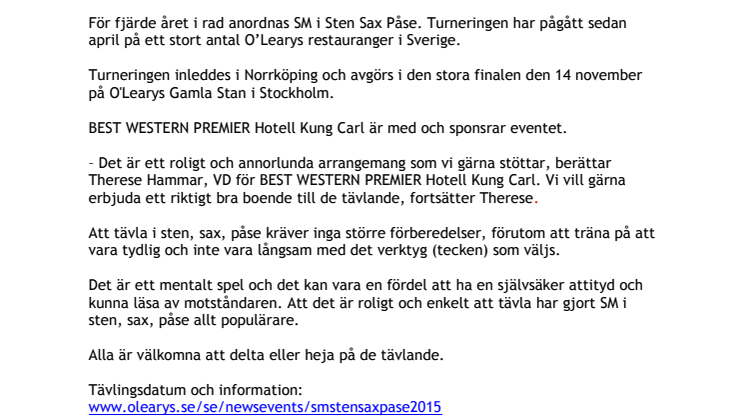 BEST WESTERN PREMIER Hotell Kung Carl sponsrar SM i sten, sax, påse!