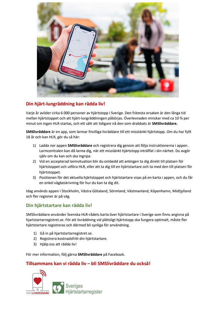 Varje år avlider cirka 6 000 personer av plötsligt oväntat hjärtstopp i Sverige. Överlevnaden minskar med ca 10 % per minut om ingen hjärt-lungräddning (HLR) startas. Ett sätt att tidigare nå den som drabbats är livräddarsystemet SMSlivräddare.