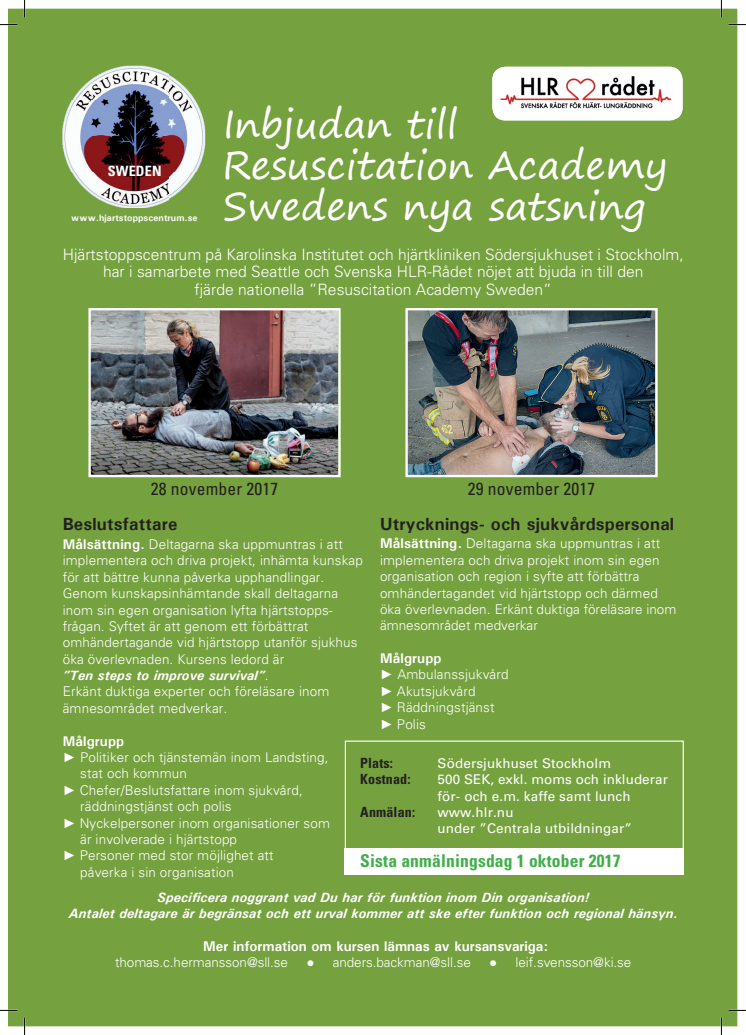 Hjärtstoppscentrum på Karolinska Institutet och hjärtkliniken Södersjukhuset i Stockholm, har i samarbete med Seattle och Svenska HLR-Rådet nöjet att bjuda in till den fjärde nationella ”Resuscitation Academy Sweden”, den 28 november 2017!