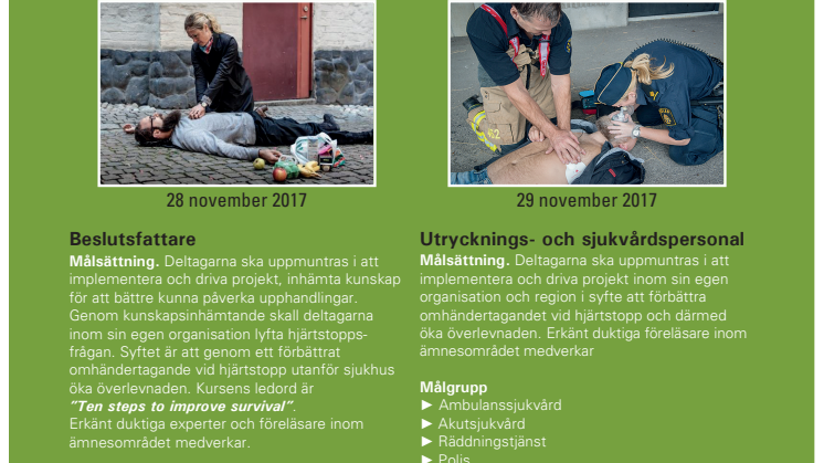 Målsättning Deltagarna ska uppmuntras i att implementera och driva projekt, inhämta kunskap för att bättre kunna påverka upphandlingar. Genom kunskapsinhämtande skall deltagarna inom sin egen organisation lyfta hjärtstoppsfrågan. Syftet är att genom ett förbättrat omhändertagande vid hjärtstopp utanför sjukhus öka överlevnaden. Kursens ledord är ”Ten steps to improve survival”. Erkänt duktiga experter och föreläsare inom ämnesområdet medverkar.