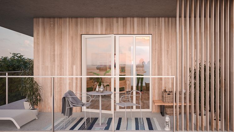 Balkong i Ösby Sjöpark. BEtongstommen kläs med värmebehandlad furu.
