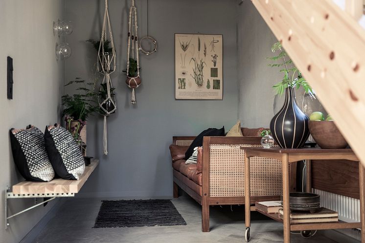 Soffa designad Arne Norell. I förgrunden trappan upp till lofte. Amplar och äldre rullbord i teak är fint ihop med det flytspacklade golvet och betongen.