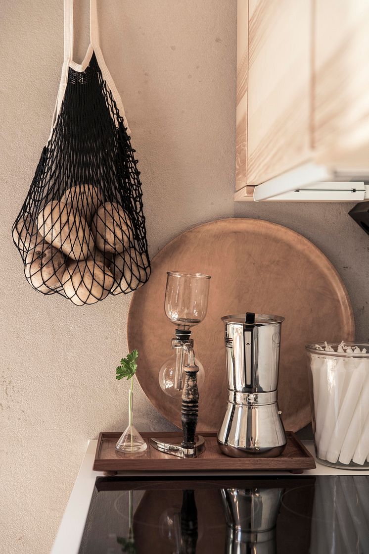 Kaffe ska bryggas med omsorg! Här en gammal espressobryggare i rostfritt stål. Kök i ask från Vedum kök och bad.
