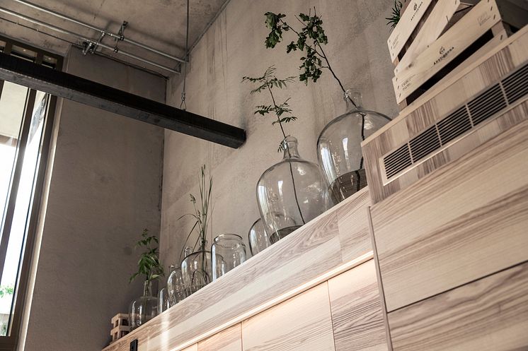 Köket kommer från Vedum kök och bad. Synliga rördragningar och rinningar i betongen från gjutformarna ger karaktär.
