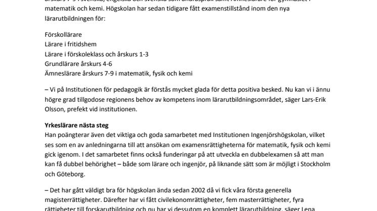 – Vi på Institutionen för pedagogik är förstås mycket glada för detta positiva besked. Nu kan vi i ännu högre grad tillgodose regionens behov av kompetens inom lärarutbildningsområdet, säger Lars-Erik Olsson, prefekt vid institutionen.