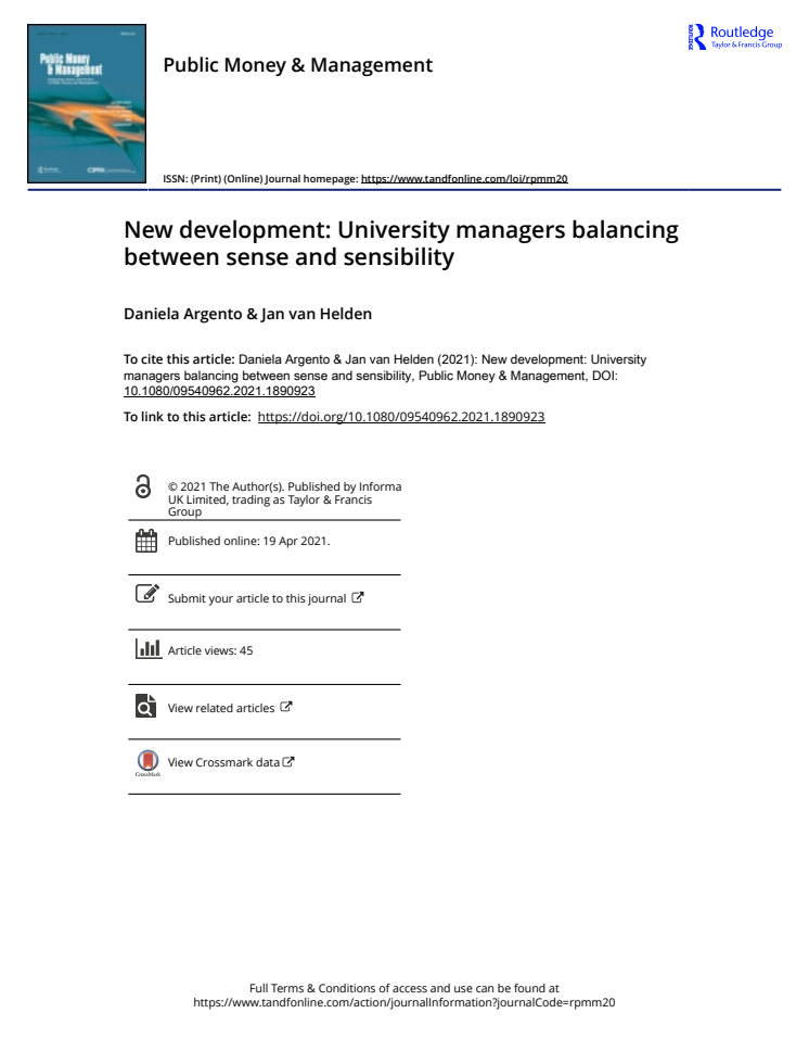 New development - University managers balancing between sense and sensibility. Daniela Argento & Jan van Helden (2021). DOI: 10.1080/09540962.2021.1890923
