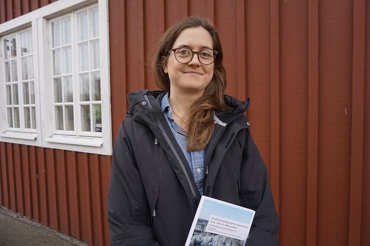 Anna Nivestam framför Agnes röda stuga med sin doktorsavhandling Health-promoting aspects of preventive home visits for older persons: An individual and a societal perspective.
