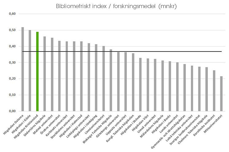 Vetenskapsrådets bibliometriska index 2020 (baserat på publiceringar 2017–2020) delat med lärosätets totala forskningsmedel enligt UKÄ för perioden 2016–2019. Förskjutning i perioden beror på att det tar ca ett år innan forskningsmedel omsätts i publikationer.