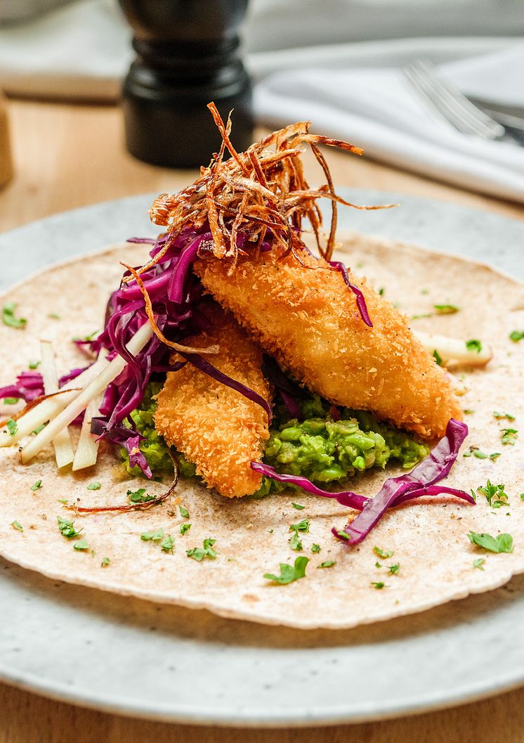 Taco med pankofriterad braxen, ärtguacamole, syrad rödkål, äpple