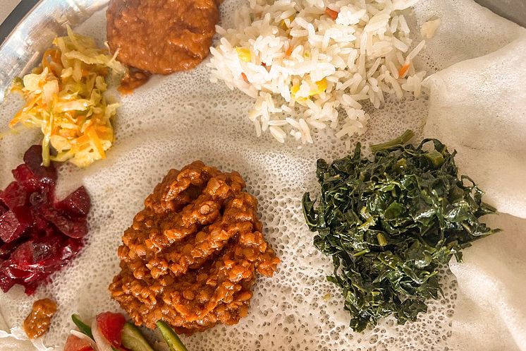 Injera är ett slags pannkaksbröd från ”surdeg” som man äter för hand med olika vegetariska grytor.