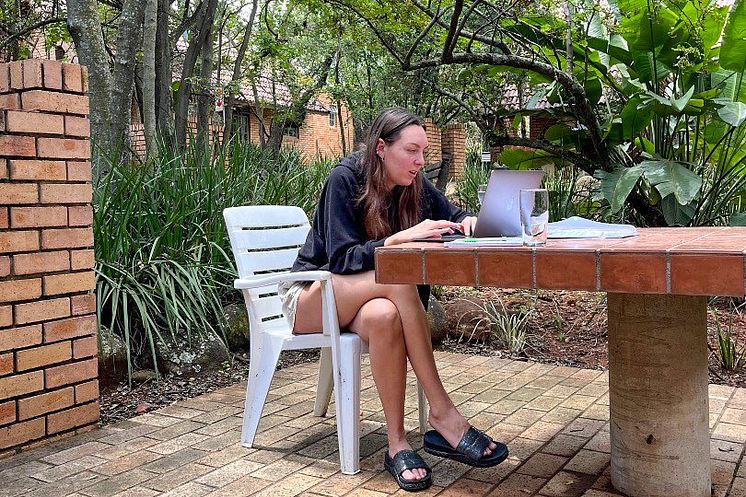 Matilda Johansson Melker skriver på examensarbetet vid boendets uteplats.