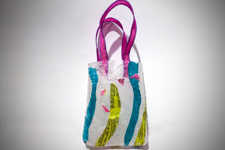 Plastväska tillverkad av ihopsmälta plastpåsar med ”fused-metoden”, tillverkad av ett barn under Maries workshop.