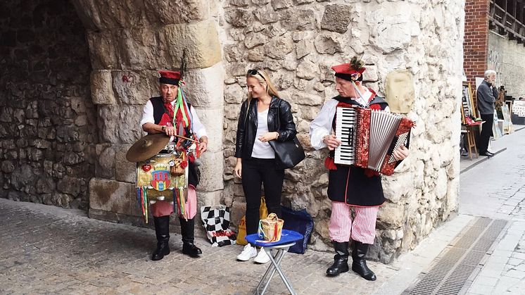 Monika Kubiak tillsammans med musikanterna vid St Florian’s Gate i Krakow. Folkdräkterna är specifika för staden och de som bär dem kallas för ”Krakowiak”.