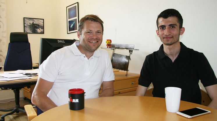 Mikael Ericsson, en av högskolans prefekter och Ahmed Alhussein träffades över en kopp kaffe på högskolan. De har båda anmält sig till Double Cup, ett integrationsprojekt inom Trollhättan stad.