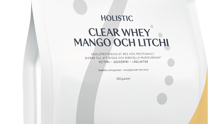 Nyheten Cleay Whey vassleproteinisolat i smaken mango och litchi är ett högkvalitativt vassleprotein med en hög proteinhalt, samtidigt som mängden fett, laktos och kolhydrater är minimal på grund av bearbetningen av produkten. Vassleproteinisolatet är ultrafiltrerat och framställt genom kemikaliefri membranfiltrering, vilket resulterar i en av de renaste och mest högkoncentrerade formerna av vassleprotein som snabbt kan tas upp av kroppen. Holistic Clear Whey framställs av mjölk från gräsbetande kor på europeiska gårdar, främst nordiska sådana. Trots produktens låga halt av laktos har enzymet laktas adderats för att hjälpa till att bryta ner den laktos som finns kvar, vilket gör att även personer som är lite eller måttligt känsliga för laktos ofta kan inta produkten.