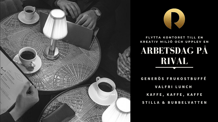 Rivals nya paket för "hemmajobbaren" inkluderar stor frukostbuffé, valfri lunch, Wi-Fi samt valfritt kaffe, stilla och kolsyrat vatten i obegränsad mängd hela dagen för 355 kr/person exkl moms (398 kr inkl moms).