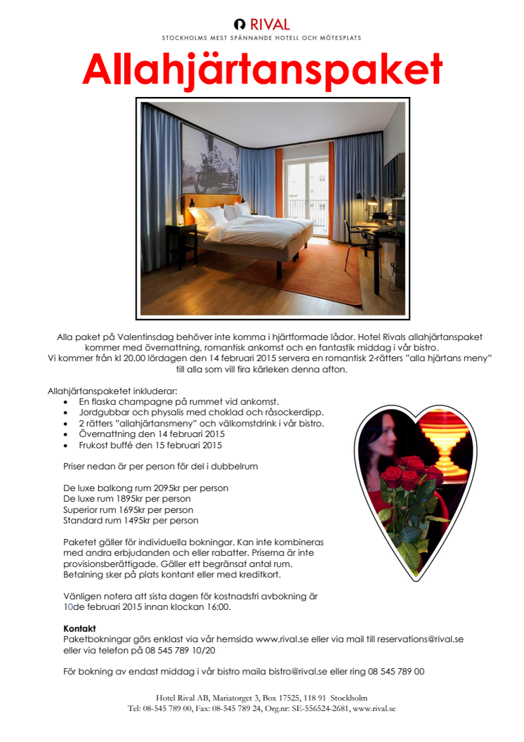 Alla paket på Valentinsdag behöver inte komma i hjärtformade lådor. Hotel Rivals allahjärtanspaket kommer med övernattning, romantisk ankomst och en fantastik middag i vår bistro.