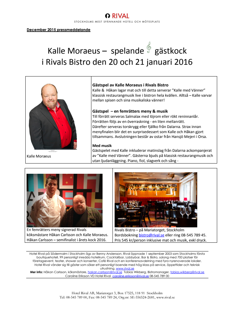 Kalle Moraeus – spelande gästkock i Rivals Bistro den 20 och 21 januari 2016
