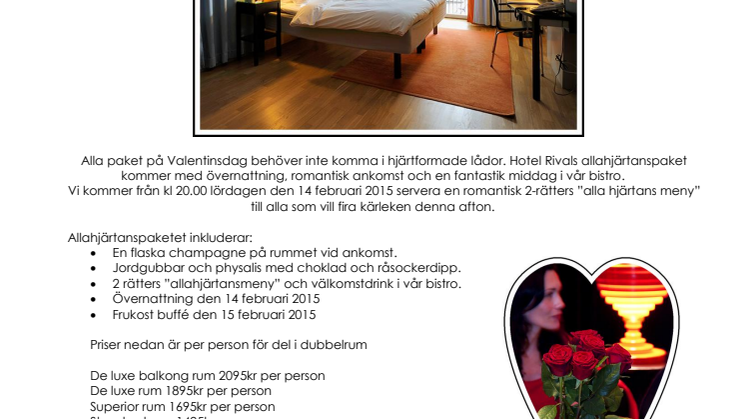 Alla paket på Valentinsdag behöver inte komma i hjärtformade lådor. Hotel Rivals allahjärtanspaket kommer med övernattning, romantisk ankomst och en fantastik middag i vår bistro.