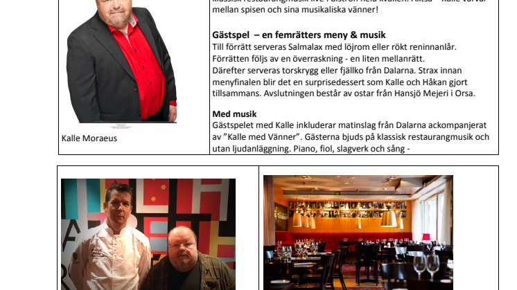 Kalle & Håkan lagar mat och till detta serverar ”Kalle med Vänner” klassisk restaurangmusik live i bistron hela kvällen. Alltså – Kalle varvar mellan spisen och sina musikaliska vänner!
