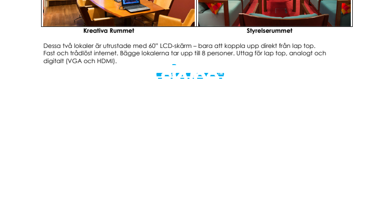 Dessa två lokaler är utrustade med 60” LCD-skärm – bara att koppla upp direkt från lap top. Fast och trådlöst internet. Bägge lokalerna tar upp till 8 personer. Uttag för lap top, analogt och digitalt (VGA och HDMI).