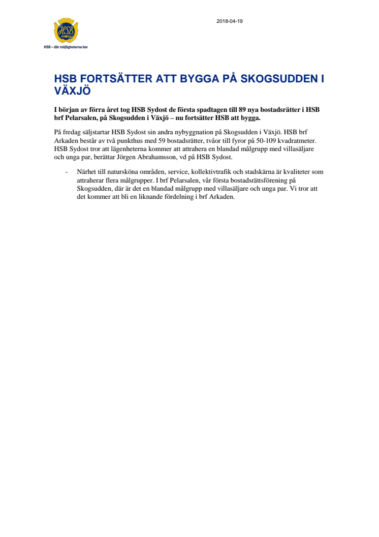 HSB FORTSÄTTER ATT BYGGA PÅ SKOGSUDDEN I VÄXJÖ