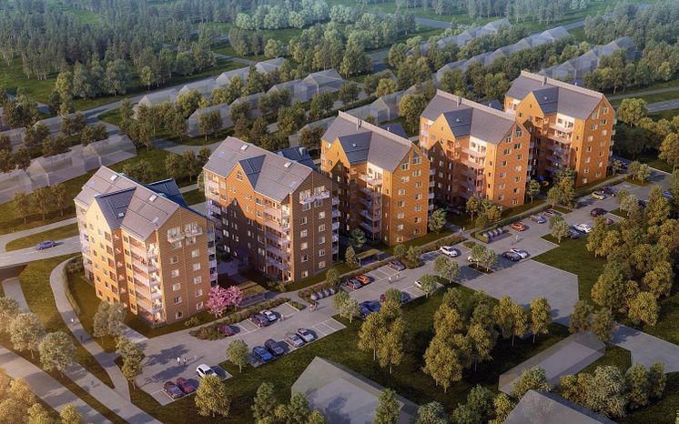 Visualiserad vy över brf Pelarsalens tre hus och brf Arkadens två hus.