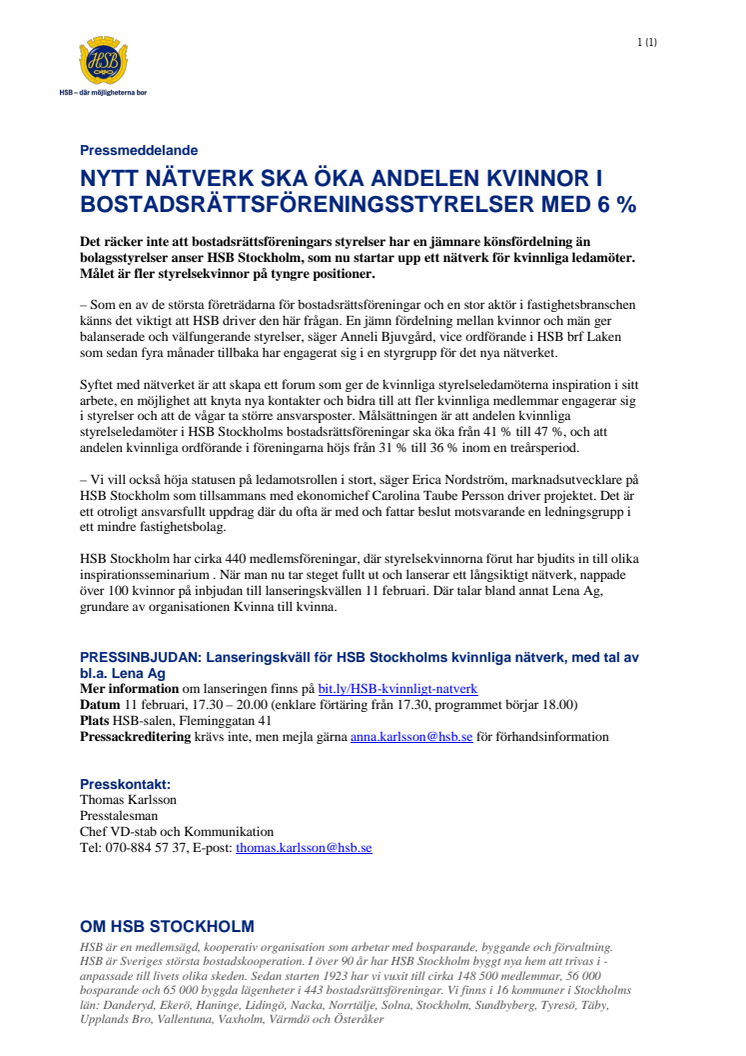 HSB Stockholm har cirka 440 medlemsföreningar, där styrelsekvinnorna förut har bjudits in till olika inspirationsseminarium . När man nu tar steget fullt ut och lanserar ett långsiktigt nätverk, nappade över 100 kvinnor på inbjudan till lanseringskvällen 11 februari. Där talar bland annat Lena Ag, grundare av organisationen Kvinna till kvinna.