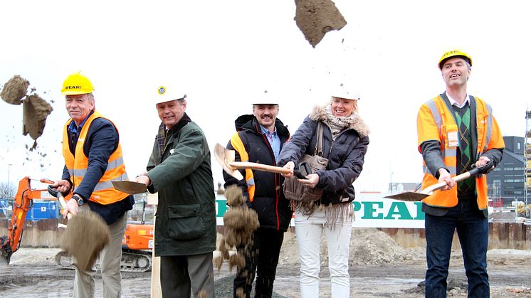 De gyllene spadarna svingades av (på bilden fr v) arkitekten Nils P Johansson, Claes Caroli, Silvano och Ingrid Krajcer (de första köparna som tecknade sig för en lägenhet) och Morgan Palmgren från PEAB som bygger.